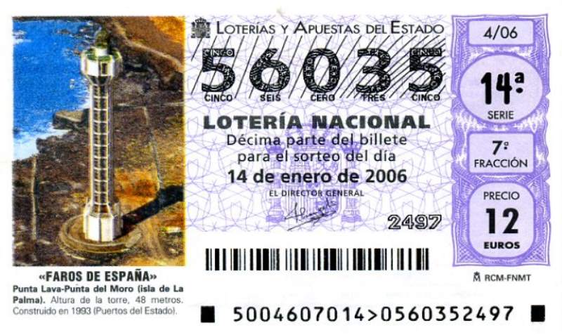 -14 de enero de 2006 Lotería Nacional de {LAE} Lotería y Apuestas del Estado emite una serie denominada «faros de España». En el sorteo, que se celebra hoy, los décimos aparecen con la imagen del “faro de Punta Lava” y la siguiente leyenda: Punta Lava- Punta del Moro {isla de la Palma}. Altura de la torre, 48 metros. Construido en 1993 [Puertos del Estado].