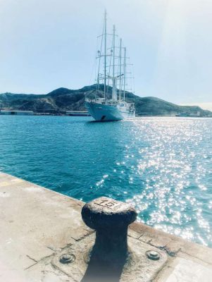 El -Wind Star- es un velero de cuatro mástiles. Pertenece a la naviera estadounidense «Windstar Cruises». Navega bajo bandera de Bahamas. Su eslora es de 134 metros. Puede albergar a 148 pasajeros y todos sus camarotes, 73 en total, tienen vistas al mar. Su tripulación es de 91 personas. Se construyó en 1987. Está considerado un crucero de lujo. Como curiosidad os diremos que, sus cuatro cubiertas son de madera de teca. Tiene dos restaurantes principales: El -Amphora-, con cocina gourmet, y el -Veranda- con un bufé informal.