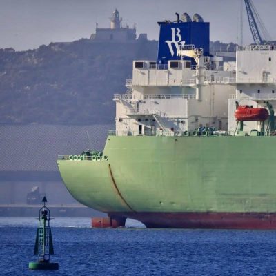 El -BW Boston- LNG Tanker se dirige hacia su destino, flanqueado por la baliza y el faro de Escombreras.
