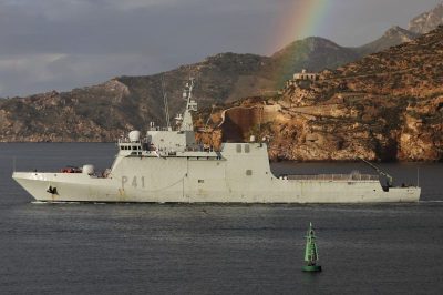 El patrullero P-41 -Meteoro- flanqueado por la baliza y por el arcoíris