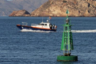 La lancha del práctico del Puerto de Cartagena rebasando la baliza del Bajo de Santa Ana