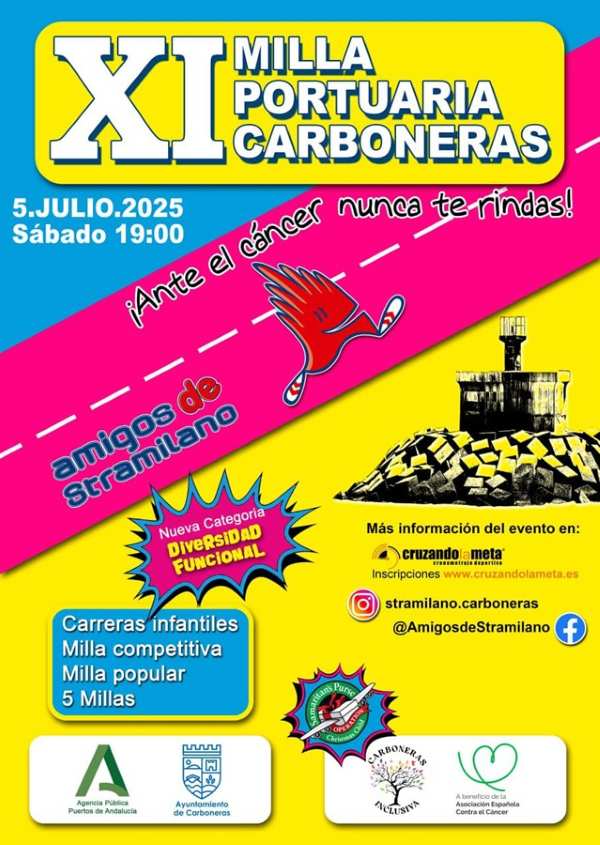 Esta tarde se ha corrido la XI Milla Portuaria de Carboneras en los alrededores del puerto pesquero de esta localidad. Esta carrera organizada por la asociación “Amigos de Stramilano” tiene un marcado carácter altruista, puesto que la asociación colabora estrechamente con la -AECC- Asociación Española contra el Cáncer, con Cáritas y también con Carboneras Inclusiva. Además, cuenta con el apoyo del Ayuntamiento de Carboneras.
