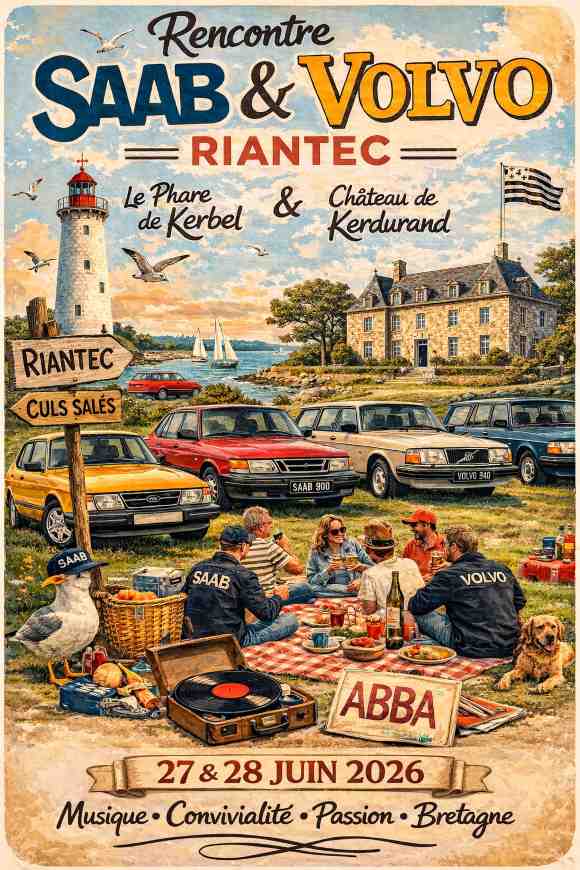 La imagen de cabecera corresponde al cartel provisional de la concentración de vehículos Saab y Volvo, «Recontre Saab & Volvo», que se llevará a cabo en la localidad francesa de Riantec.