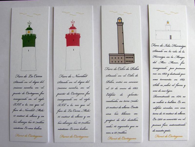 Queremos informaros sobre nuestro próximo concurso, que precisamente empieza mañana en colaboración con Obsequia Regalos Inusuales. Se trata del «Trivial de los faros». Vamos a regalar 25 juegos de marcapáginas con las imágenes de algunos de los faros que hay en Cartagena. Una deferencia como viene siendo habitual de nuestros amigos de Obsequia Regalos Inusuales. Esta página amiga nos ha ofrecido el apoyo y los medios necesarios para elaborar los regalos con los que obsequiaremos a los afortunados.