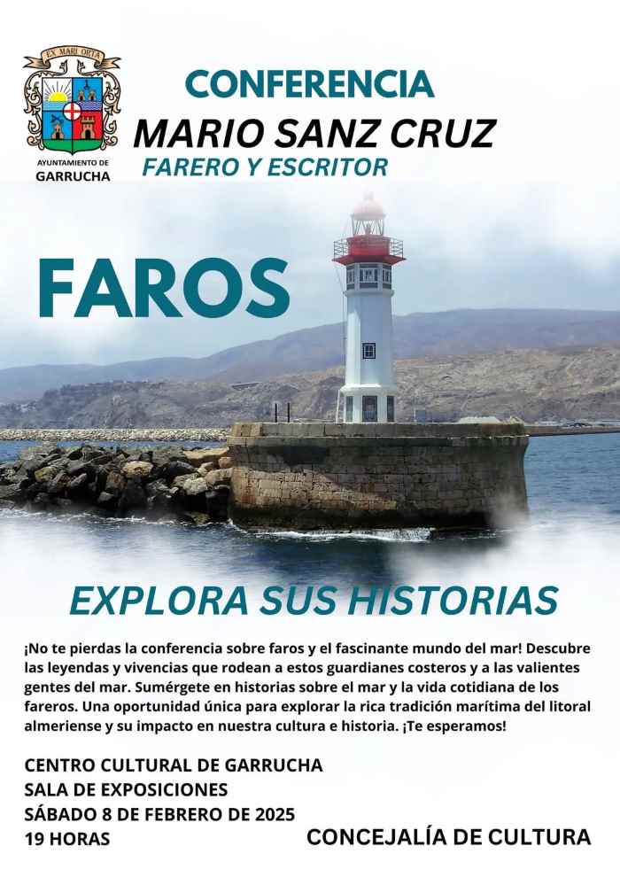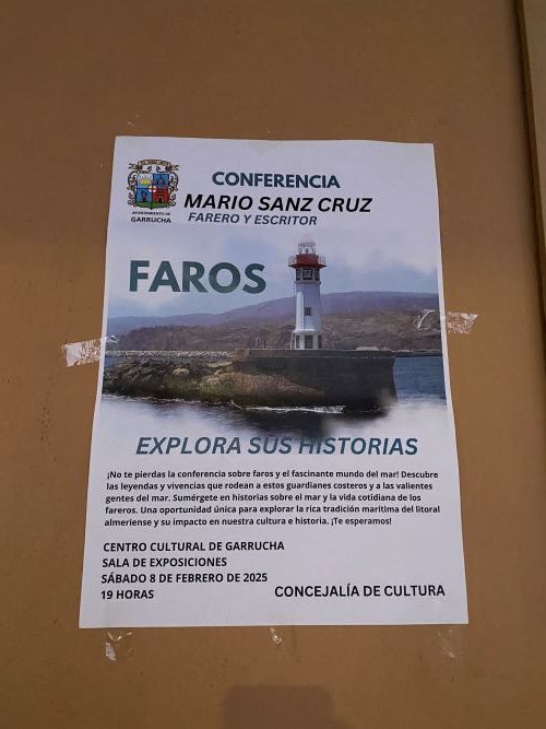 La imagen de cabecera corresponde al cartel anunciador de la conferencia de Mario Sanz Cruz «Faros», en Garrucha.