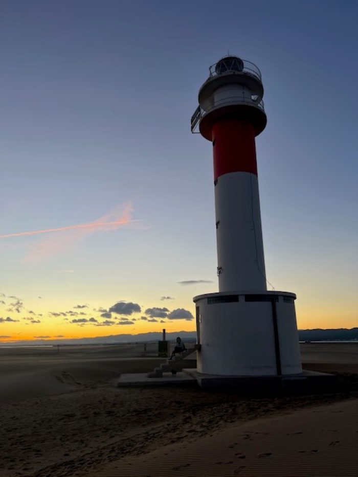 En la imagen de cabecera podemos ver a Tati sentada en la escalera de acceso al «faro del Fangal», situado en el Delta del Ebro, dispuesta a contemplar una preciosa puesta de sol.