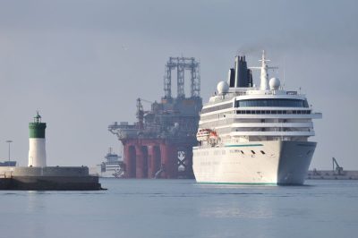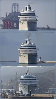 Miguel se ha centrado tanto en la proa del buque como en la maniobra de arribo al puerto sin olvidar, por supuesto, el paso de este gigante por los faros de nuestra preciosa bahía.
