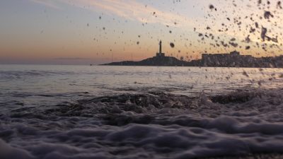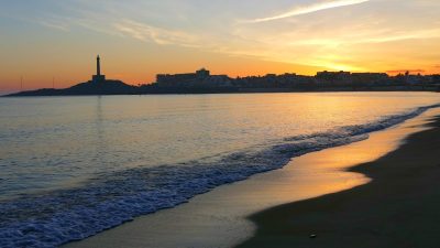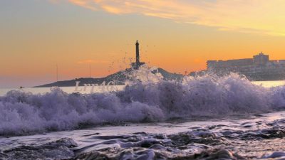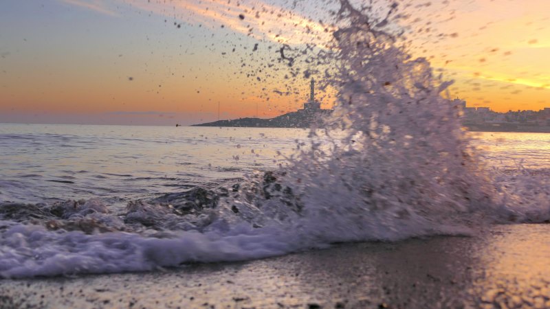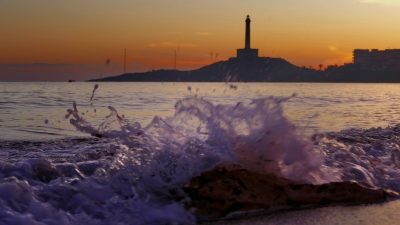 En la imagen de cabecera se aprecia la silueta del “faro de Cabo de Palos” detrás de una ola que rompe en la orilla de playa.