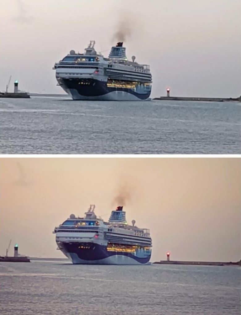 Una vez más, Pruden ha madrugado para darle la «bienvenida» a este crucero. Y casualmente, ha hecho una fotografía del buque tras dejar atrás los faros de Navidad y de la Curra en la que están las dos luces encendidas.