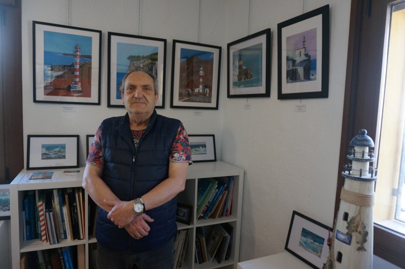 En la imagen de cabecera aparece José Mª Ibarzabal posando delante de algunas de sus obras expuestas en el faro de Mesa Roldán.