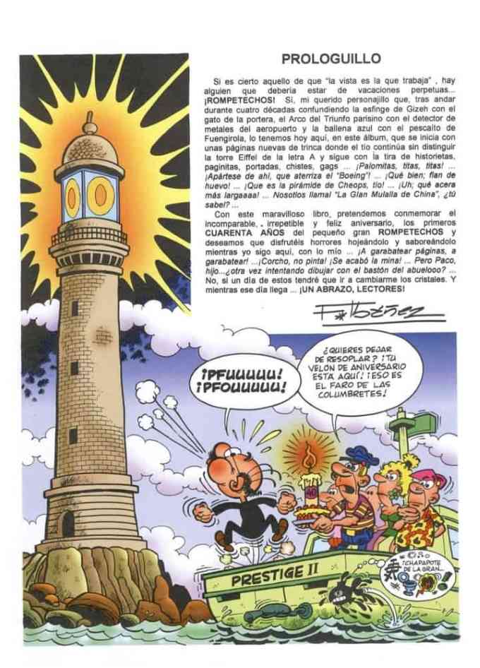 Oficialmente, Rompetechos tuvo su primera aparición el 6 de abril de 1964, por lo que este homenaje se adelantó un año en el tiempo. Nosotros nos hacemos eco de esta efeméride porque Ibáñez en el prólogo de la historieta dibujó a Rompetechos junto a un faro, que no es como se dice en el “bocadillo”, el de las islas Columbretes.