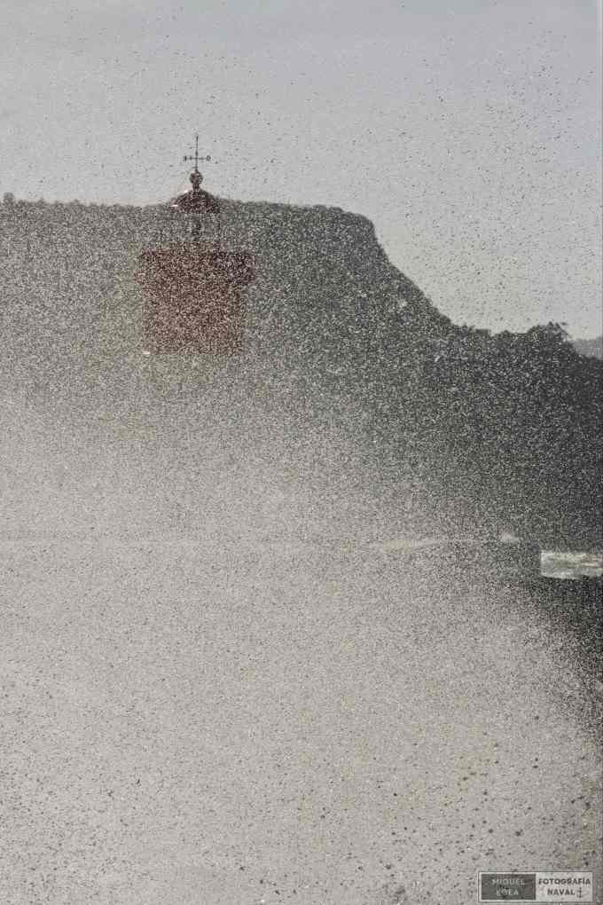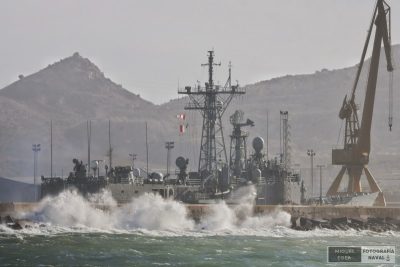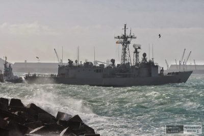 Pues bien, nuestro buen amigo Miguel Egea se encontraba en su “oficina” a la caza de uno de los buques de la Armada española, ni más ni menos que la fragata “Navarra” F-85, cuando le ha sorprendido la borrasca «Nelson». Realmente, sabemos que no le ha sorprendido porque él, además de controlar todo lo relacionado con la entrada y salida de nuestros barcos, es muy metódico en cuanto a la planificación de sus fotografías, ya que se fija en las condiciones meteorológicas que se va a encontrar. Como lo conocemos, sabemos que estará diciendo: ¡Hala, que exageraó!