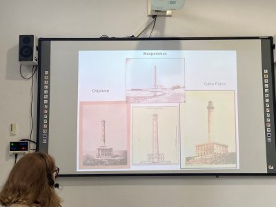 De los más de 110 faros que se levantaron en nuestras costas, la doctora Roda Alcantud se ha centrado en los tres más imponentes: el faro de Maspalomas {islas Canarias}, el de Chipiona {Andalucía} y el de Cabo de Palos {Región de Murcia}. Ha comentado muchas similitudes entre ellos; a pesar de que no son coetáneos, no están ubicados en la misma zona geográfica y fueron construidos por ingenieros distintos. Estos faros junto con la “Torre de Hércules” {Galicia} eran los más altos del país, y a fecha de hoy, lo siguen siendo.