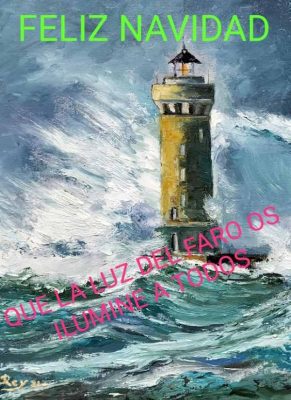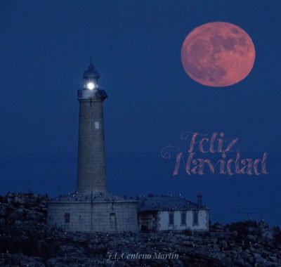 José Rey Ripollés nos ha felicitado con uno de sus marvillosos óleosMari Lu Valencia Centeno nos ha mandado esta feliictación usando una fotografia de «Nubble light»Pep Aguilar ha encontrado este faro en un Belén y ha decidido usarlo para participarLa felicitación más graciosa es de Diana Pérez, Un calcetín navideño junto a un marcapáginas del faro de NavidadJuan Luis Centeno nos ha enviado una fotografía suya de la luna sobre el faro de la isla de Mouro para participar