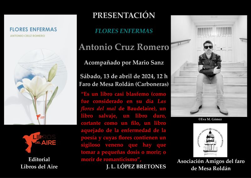 Hoy, sábado 13 de abril, hemos podido asistir en el faro de Mesa Roldán a la presentación de un poemario llamado «Flores enfermas», obra del poeta y narrador Antonio Cruz Romero. Este evento ha sido organizado una vez más por la “Asociación Amigos del faro de Mesa Roldán” y ha contado con la presencia obvia de Mario Sanz Cruz, farero de este emblemático faro, y Miguel que ha presentado tanto al autor como al poemario.