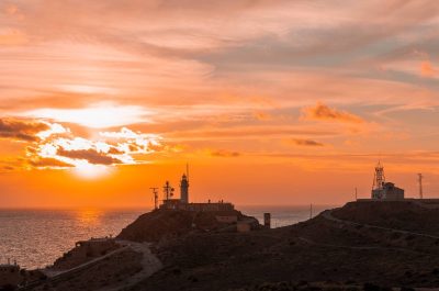 Gracias a la altura a la que se encuentra situado el “faro de Cabo de Gata”, [36 m s. n. m.], se aprecia mucho mejor el ocaso. Pero en esta ocasión, nos comenta Rubén que el exceso de nubes dificultaba una perfecta visión del sol. No obstante, creemos que las dos imágenes que os mostramos son hermosas.