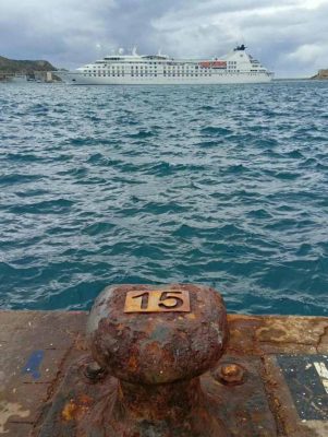 En esta ocasión, no os vamos a decir que Pruden estaba entrenando, sino que estaba paseando, puesto que por la noche participaba en la VII Night Run «Arx Asdrubalis». Ya os dijimos que tiene muchas aficiones. Sus fotografías desde el muelle de cruceros se han vuelto clásicas en nuestro blog. Como sabéis, suele enviarnos imágenes de los cruceros pasando entre los faros de Navidad y de la Curra. Para seguir con la maniobra de atraque, sin olvidar una foto de la proa y otra de un noray. No nos cansamos de ver la espectacularidad de buques como éste arribando a nuestro hermoso puerto.