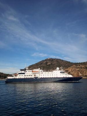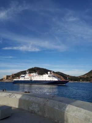 Hoy, 5 de noviembre, han arribado al puerto de Cartagena dos cruceros totalmente antagónicos. Por un lado, el -Artania- de la naviera «Phoenix Reisen GMBH» con 1.188 pasajeros y, por otro, el -MV Belle des Océans- con 129 pasajeros. Ambos cruceros han coincidido durante una hora aproximadamente en la terminal de cruceros. Así que los que hemos tenido oportunidad de verlos, podemos afirmar que la diferencia de tamaño era vasta.