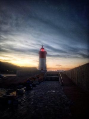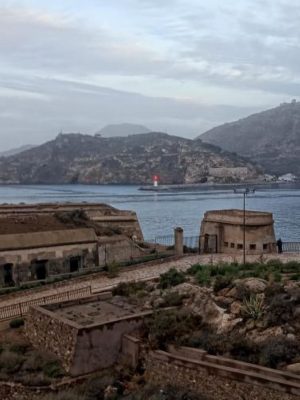 Pues bien, ha aunado todas esas aficiones y el resultado es un buen puñado de maravillosas fotografías. Pruden cuando sale a entrenar suele llevar el teléfono móvil, y así, al detenerse para hacer estiramientos u otros ejercicios aprovecha para fotografiar el puerto de Cartagena desde diferentes lugares. Dependiendo del lugar hacia el que dirija sus entrenamientos, aparece por encima del faro de la Curra o bien del faro de Navidad.