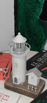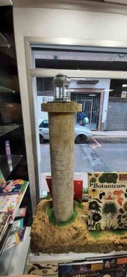 El cartel de la librería “faro” ya ha despertado mi curiosidad, pero esa no ha sido la única sorpresa, puesto que en el interior nos aguardaba una decoración muy farera. Juanjo, el dueño de este negocio, ha decorado su librería con dos réplicas de faros. El más grande, se encuentra sobre un diorama y se ilumina, por lo que hace mucho más llamativo el escaparate. El otro faro es mucho más pequeño, también se ilumina con un led. Es un objeto de decoración que está a la venta en una cadena de comercios francesa dedicada al bricolaje. Juanjo lo ha colocado entre los libros recomendados.